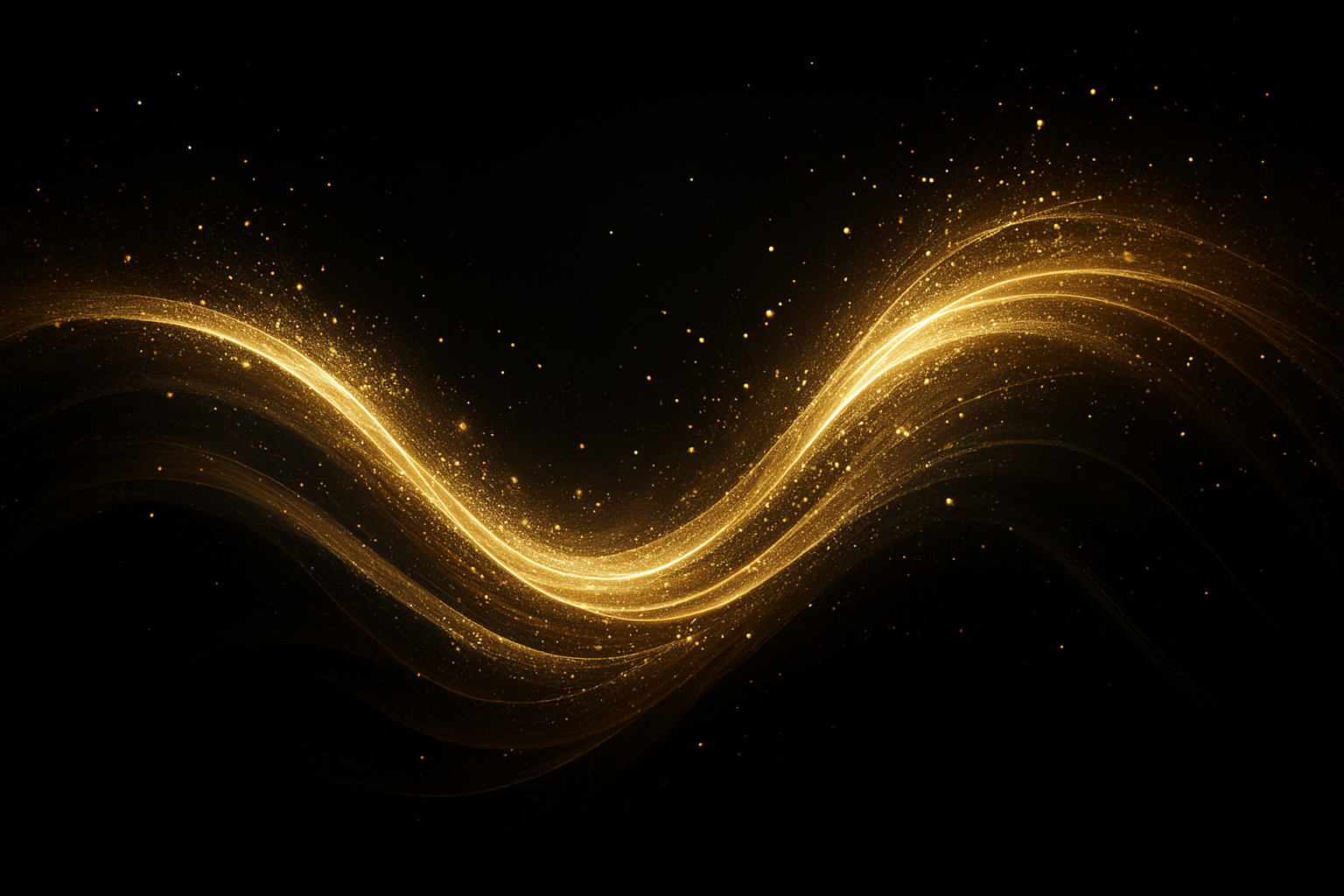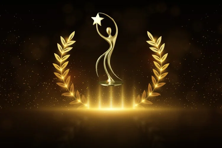 Five women in black dresses and suits celebrating at an event with a gold and black glittery backdrop and balloon decorations. One woman in the center holds a clear award plaque.